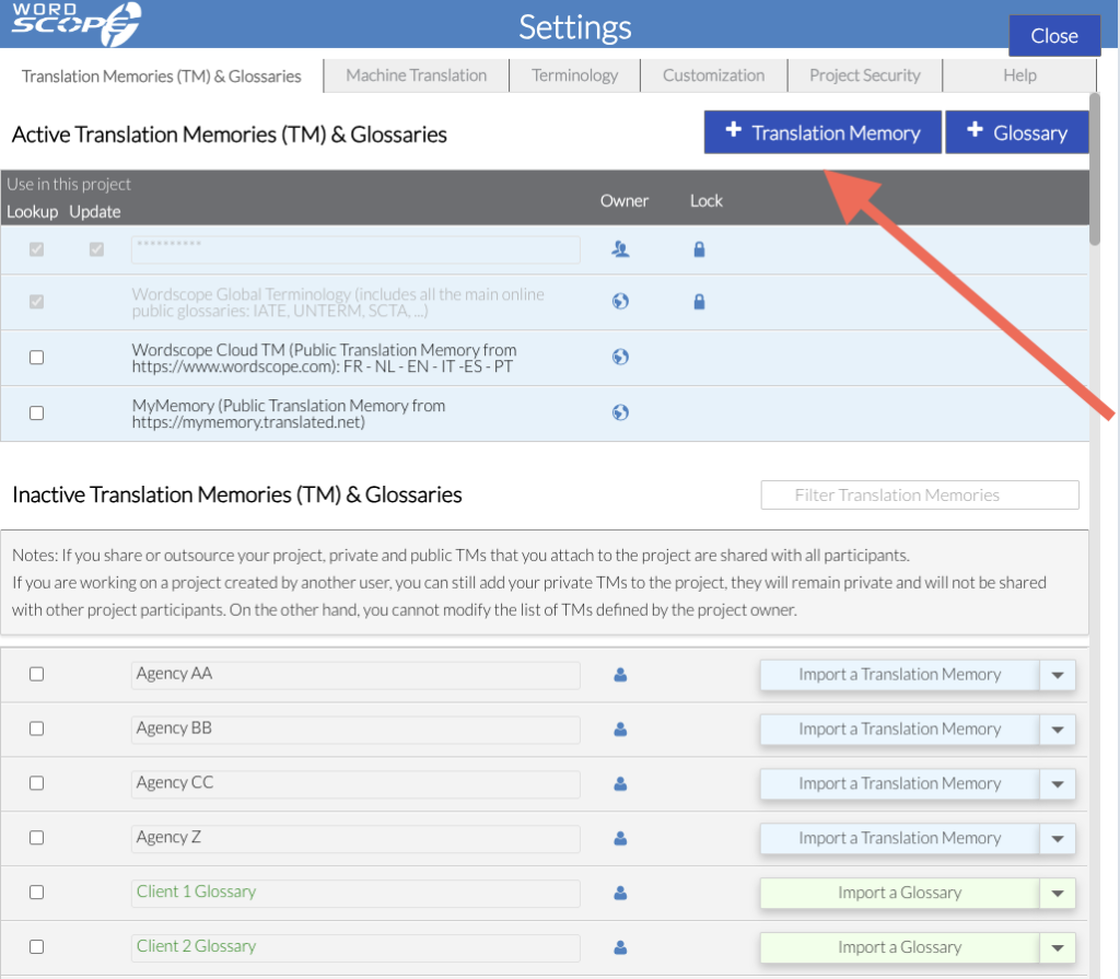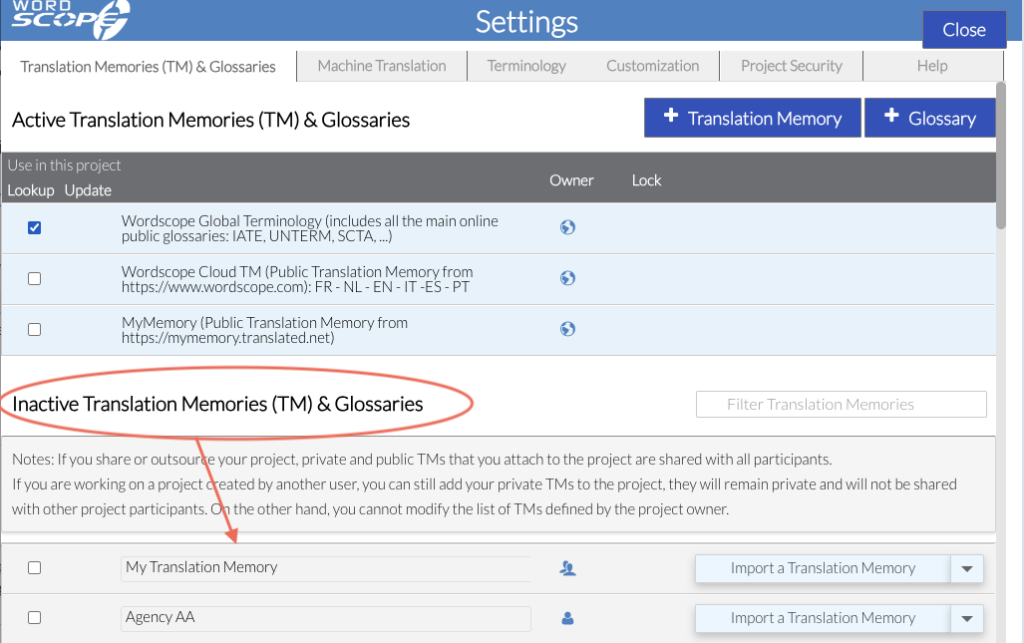 The Translation Memory will then be moved to the Inactive Translation Memories and Glossaries section.