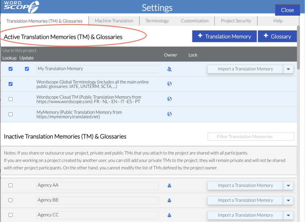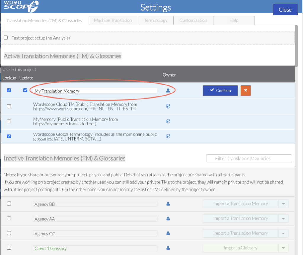 Your Translation Memory now appears in the Active Translation Memories and Glossaries section, which means it is active for the current project.
