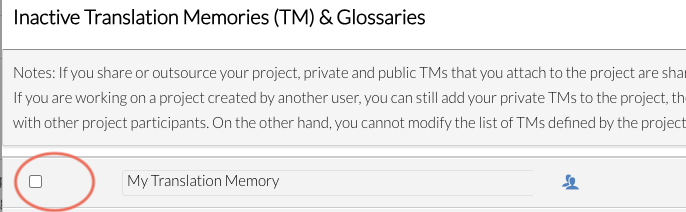 If a Translation Memory appears in the Inactive section, select the checkbox next to it to activate it for the current project. It will then be moved to the Active section.
